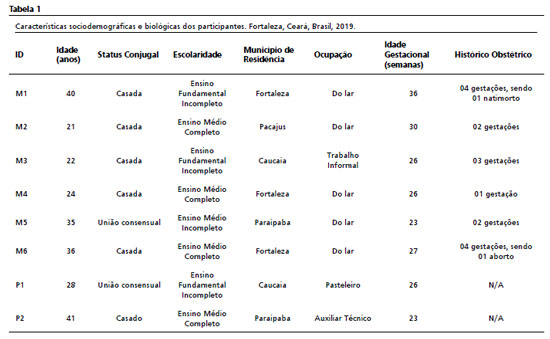 Resultados e DiscussãoA respeito do perfil dos entrevistados, todos residiam em municípios da Região Metropolitana de Fortaleza e tinham idades entre 21 e 41 anos. Todos eram alfabetizados, sendo o nível médio completo a maior escolaridade apresentada. As gestantes estavam com idades gestacionais entre 23 e 36 semanas. O número total de gestações, considerando a atual, variou de uma a quatro. Somente uma mulher apresentou histórico de aborto, e outra relatou história prévia de natimorto relacionado à anomalia fetal. Na Tabela 1 estão discriminadas as características sociodemográficas e biológicas de cada participante a fim de oferecer uma visão mais detalhada acerca das pessoas entrevistadas.