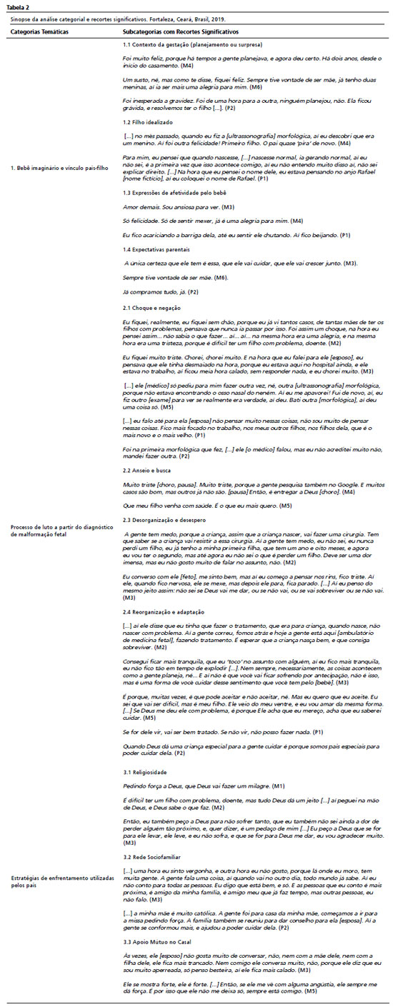 A partir da análise realizada, foram identificadas três categorias temáticas principais: 1) Bebê imaginário e vínculo pais-filho; 2) Processo de luto a partir do diagnóstico de malformação fetal; e 3) Estratégias de enfrentamento utilizadas pelos pais. Essas categorias, inicialmente orientadas pelo marco teórico da pesquisa, foram refinadas e enriquecidas pelos dados emergentes das entrevistas. Na Tabela 2, apresenta-se um quadro sinóptico com a sumarização das categorias temáticas e os recortes das falas mais significativas que as representam, as quais sustentaram as discussões subsequentes.