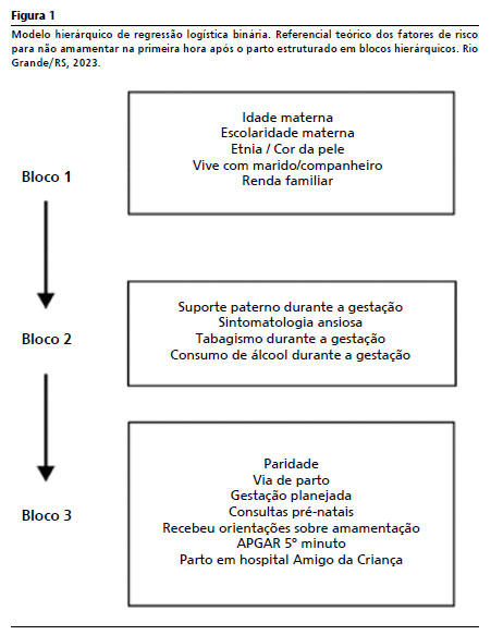 A Figura 1 mostra o modelo hierárquico de regressão logística binária. Referencial teórico dos fatores de risco para não amamentar na primeira hora após o parto estruturado em blocos hierárquicos.