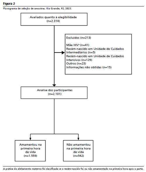 ResultadosUm total de 2.314 partos foram realizados no ano de 2019. Na amostra do estudo, 213 (9,2%) foram excluídos por apresentarem complicações que impediram a amamentação na primeira hora do nascimento: mães com diagnóstico de HIV (n=41), recém-nascidos internados em unidade de cuidados intermediários (n=5), recém-nascidos internados em unidade de terapia intensiva (n=129) e outros motivos (n=23). Ainda houve a exclusão por não obter acesso às informações necessárias (n=15 perdas). Assim, 2.101 nascimentos foram incluídos nas análises finais, sendo classificados como recém-nascidos amamentados (n=1.559, 74,2%) ou não amamentados (n=542, 25,8%) na primeira hora após o parto (Figura 2).