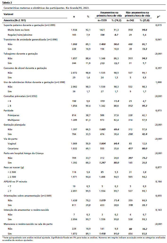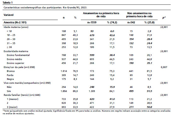As características sociodemográficas são apresentadas na Tabela 1. Menores idades maternas (até 25 anos) foram associadas à amamentação na primeira hora após o parto (49,6%), enquanto idades entre 26 a 35 anos foram associadas à não amamentação na primeira hora após o parto (52,8%) (teste qui-quadrado,
