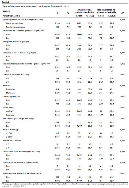 As características maternas e obstétricas das participantes estão descritas na Tabela 2. A amamentação na primeira hora de vida esteve associada a diversos fatores. Mães que relataram bom ou muito bom suporte paterno durante a gestação apresentaram maior frequência de amamentação precoce em comparação àquelas com suporte regular ou insatisfatório (