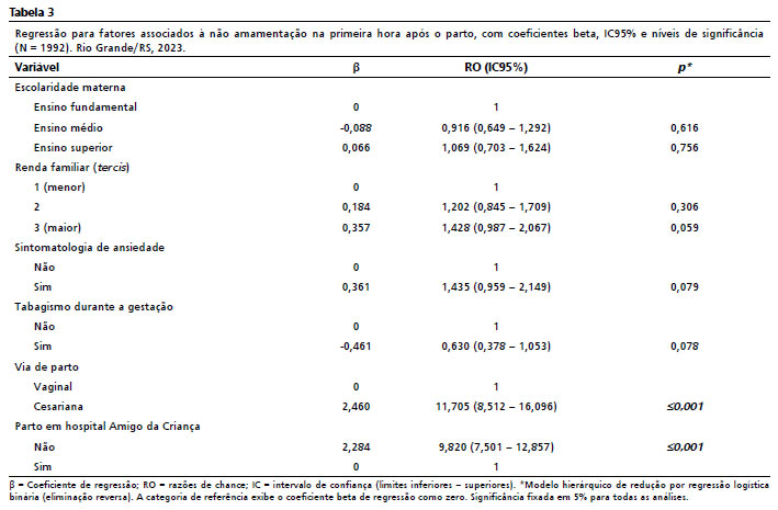 Foram realizados modelos de regressão para a não amamentação na primeira hora após o parto e fatores associados, sendo excluídas as variáveis menos associadas ao desfecho. Um modelo final hierárquico foi produzido por regressões logísticas múltiplas (conduzidas em três blocos), e foi ilustrado na Figura 1. Dados estatísticos (coeficiente beta,