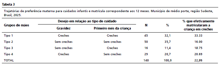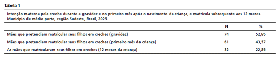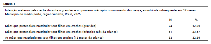 Este estudo destaca a lacuna entre intenção materna e uso real de cuidados infantis formais durante o primeiro ano de vida da criança. Embora muitas mães tenham inicialmente expressado o desejo de matricular seus filhos em creches, essa preferência muitas vezes diminuiu após o nascimento, e apenas uma minoria de crianças foi matriculada aos 12 meses de idade. Maior escolaridade materna surgiu como fator-chave associado à concretização desta intenção.