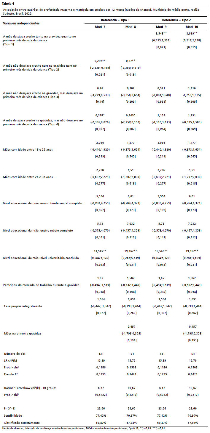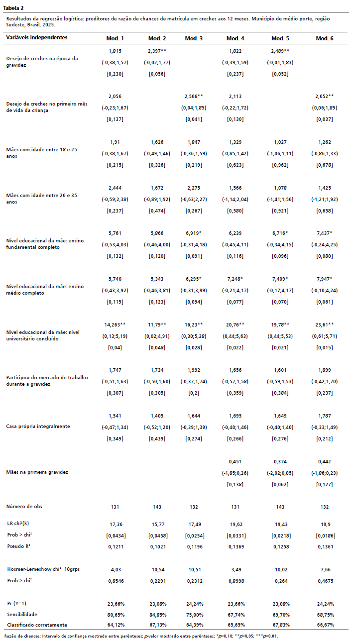 A educação materna foi o preditor mais consistente em todos os modelos. Em comparação com as mães com escolaridade incompleta, aquelas com diploma universitário eram consistentemente mais propensas a utilizar creches. A primiparidade (modelo 5) também surgiu como um preditor negativo em alguns modelos, embora o efeito não tenha sido robusto. Outras variáveis – idade materna, emprego durante a gravidez e posse de casa – não foram estatisticamente significativas.
