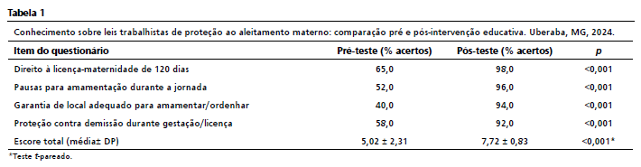 MÉTODOS: estudo quase experimental, realizado entre maio e agosto de 2024, em enfermarias de Alojamento Conjunto de um hospital universitário de Minas Gerais, com inclusão de 50 puérperas que exerciam atividade laboral remunerada e intencionavam amamentar. O conhecimento materno foi avaliado por questionário validado aplicado antes e após exibição de vídeo educativo sobre a legislação vigente. Para avaliar o efeito da intervenção educativa, foi aplicado o teste t-pareado, com significância de p≤0,05.