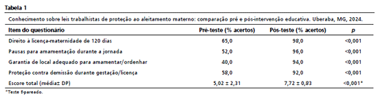Ante o exposto, o objetivo foi comparar o conhecimento de lactantes trabalhadoras sobre as leis que protegem o aleitamento materno antes e após intervenção educativa.