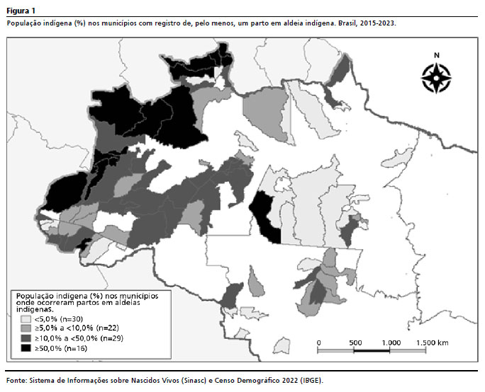 Para compatibilizar as comparações com partos de mães não indígenas, as análises incluíram somente municípios nos quais se registrou, pelo menos, um parto em aldeia indígena entre os anos 2015 e 2023 (N=97). Dados oriundos do Censo Demográfico 2022 realizado pelo Instituto Brasileiro de Geografia e Estatística (IBGE) foram utilizados para calcular proporções da população indígena residente nos municípios selecionados (Figura 1).