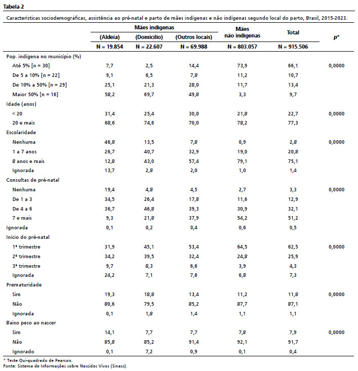 Foram excluídos os casos sem informação sobre o local do parto e cor ou raça das mães (ausente ou ignorada). As comparações entre indígenas e não indígenas foram realizadas por tabelas de contingência e teste do qui-quadrado (