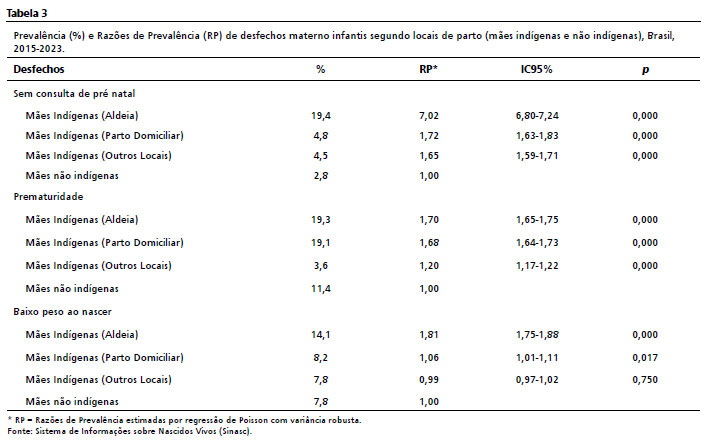 As análises ajustadas confirmaram associações significativas entre o local do parto e desfechos desfavoráveis. As mães indígenas que pariram em aldeias apresentaram sete vezes mais chance de não realizar pré-natal (RP=7,02; IC95%= 6,80–7,24), além de maior risco de prematuridade (RP=1,70; IC95%= 1,65–1,75) e de baixo peso ao nascer (RP=1,81; IC95%= 1,75–1,88), em comparação às mães não indígenas. Também houve diferenças, em menor magnitude, entre indígenas com parto domiciliar (ausência de pré-natal RP=1,72; prematuridade RP=1,68) e em outros locais (ausência de pré-natal RP=1,65; prematuridade RP=1,20) (Tabela 3).
