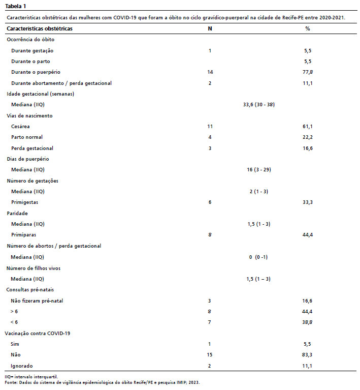 A maioria dos óbitos ocorreu no puerpério (77,8%), com idade gestacional mediana de 33,6 semanas. A cesariana foi a via de nascimento predominante (61,1%), 83,2% das mulheres realizaram pré-natal, mas apenas 44,4% fizeram mais de seis consultas e apenas uma mulher havia sido vacinada contra a COVID-19 (Tabela 1).