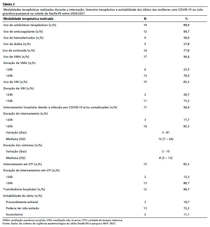 Durante a internação, 83,3% das pacientes necessitaram de UTI e 94,4% de ventilação mecânica, frequentemente por mais de 24 horas. Cerca de dois terços foram transferidas entre unidades hospitalares, evidenciando fragilidades na rede de atenção. Os antibióticos foram utilizados em 88,9% dos casos, corticoterapia em 77,8% e anticoagulantes em 66,7%. Em 72,2% dos casos, os óbitos foram classificados como evitáveis (Tabela 2). As causas básicas mais frequentes foram síndrome respiratória aguda grave e choque séptico, com informações complementadas pelos Boletins Epidemiológicos da Secretaria de Saúde do Recife e do Ministério da Saúde.